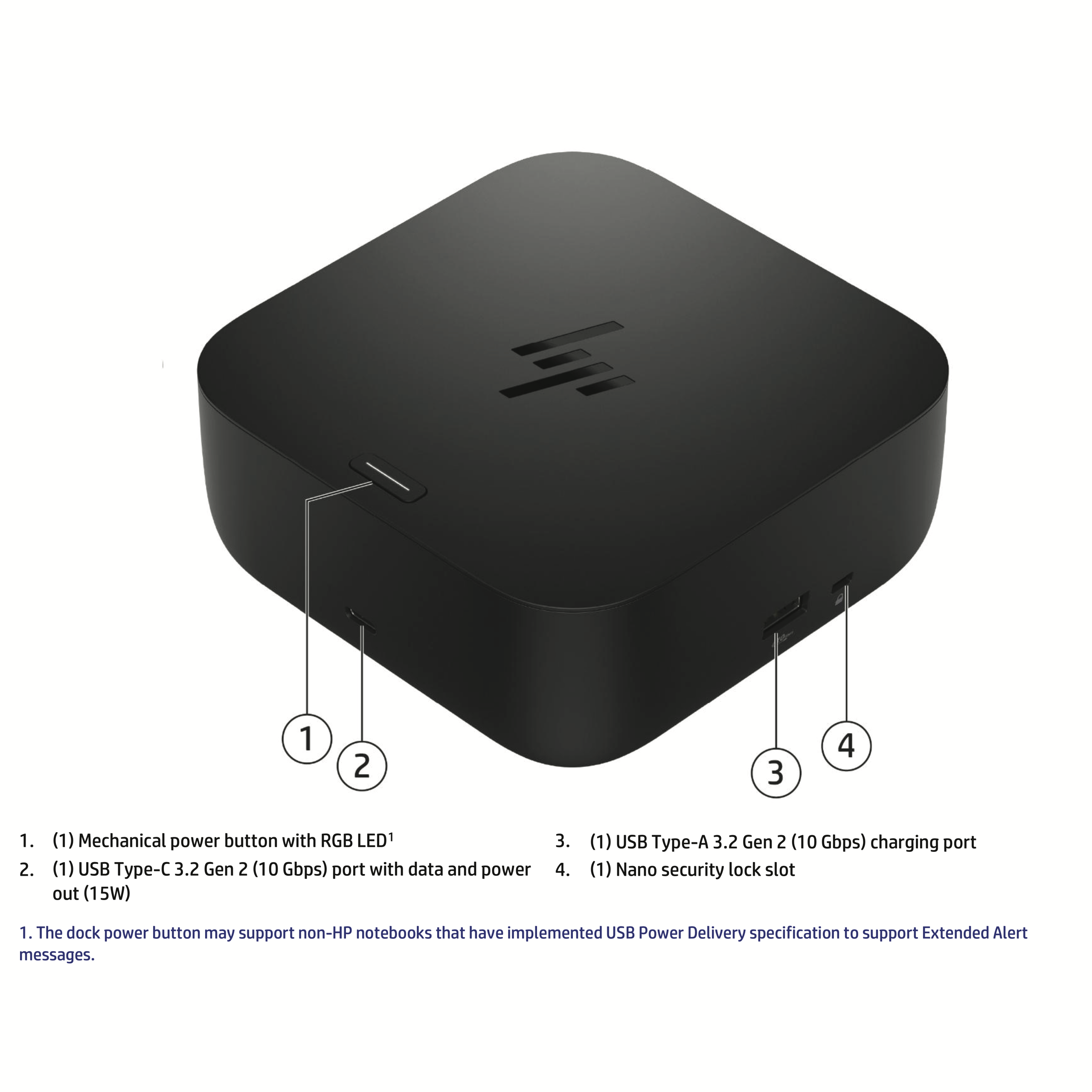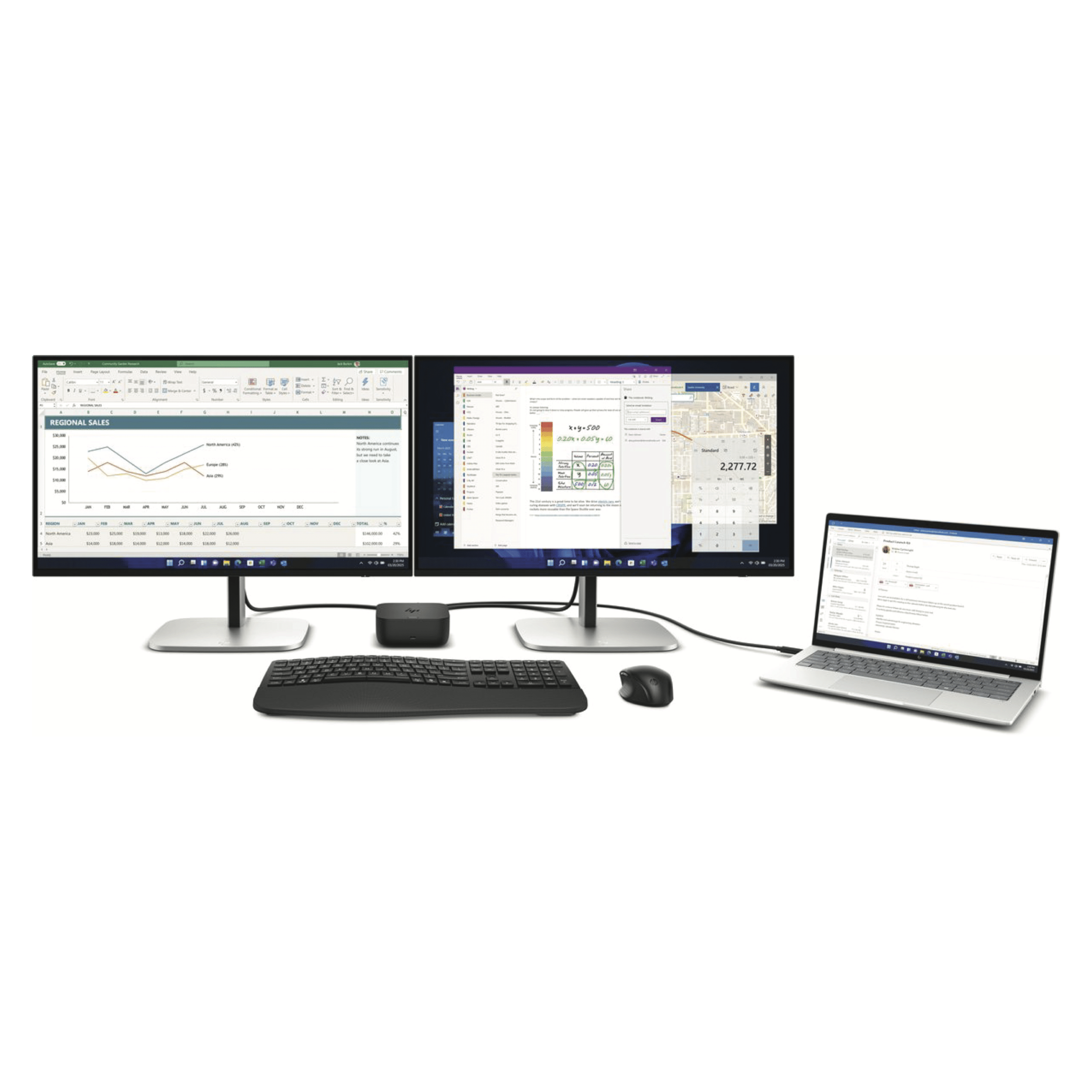 HP USB-C docking station voor kantoor of thuiswerkplek, dat tot wel 3 externe monitoren ondersteunt met hoge resoluties (tot 4K@60Hz, afhankelijk van systeem en configuratie). Het docking station is compatibel met laptops uitgerust met USB-C Alt-DP en Thunderbolt 4 / USB4.