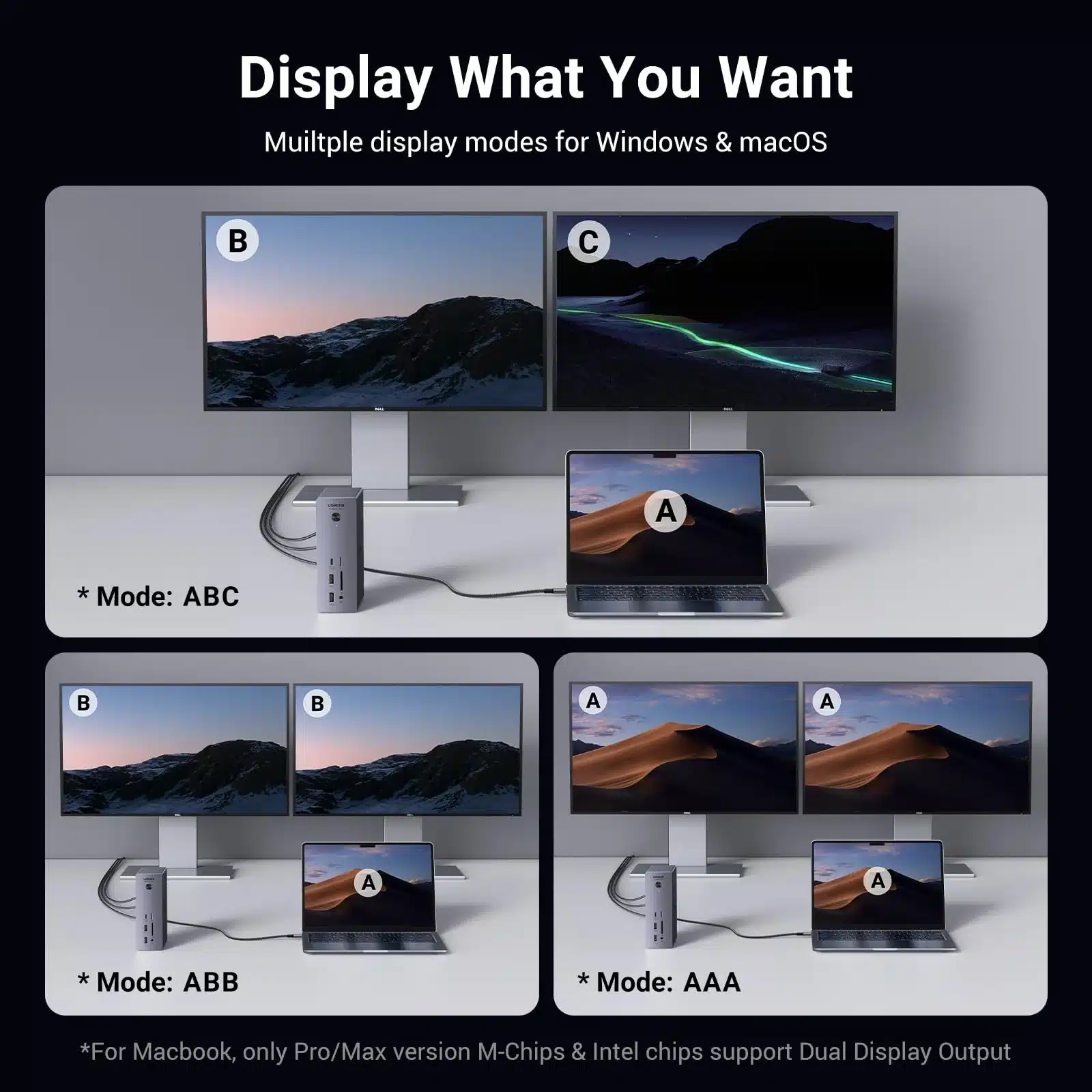 Dankzij de 2x Thunderbolt 4 downstream poorten én de ingebouwde DisplayPort 1.4 kan de Ugreen Revodok Max maximaal 2 beeldschermen tegelijk aansturen op Windows laptops en geschikte MacBooks.