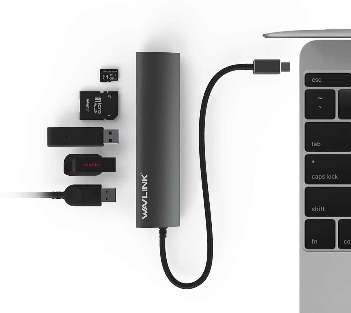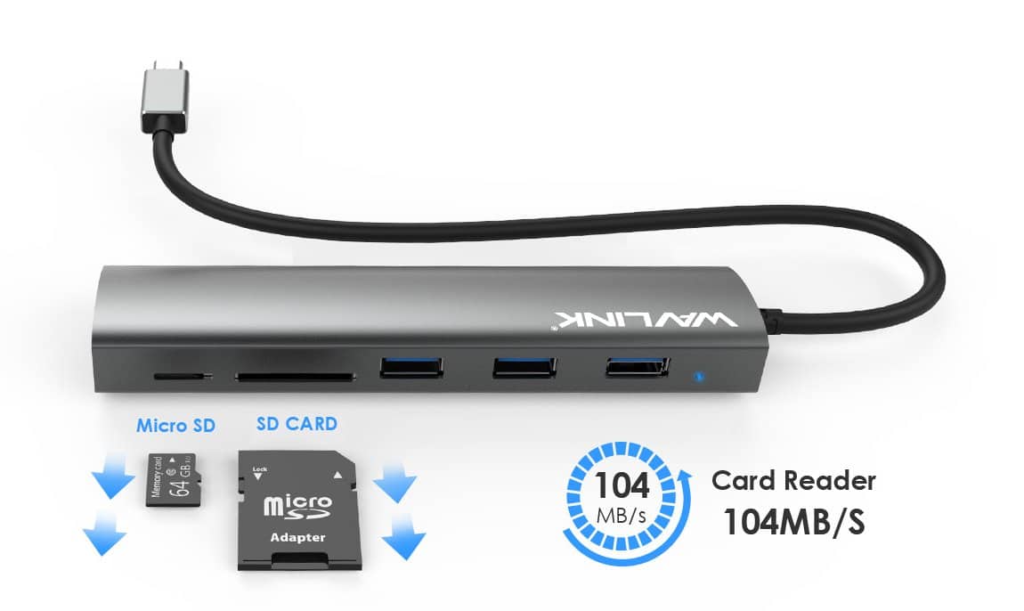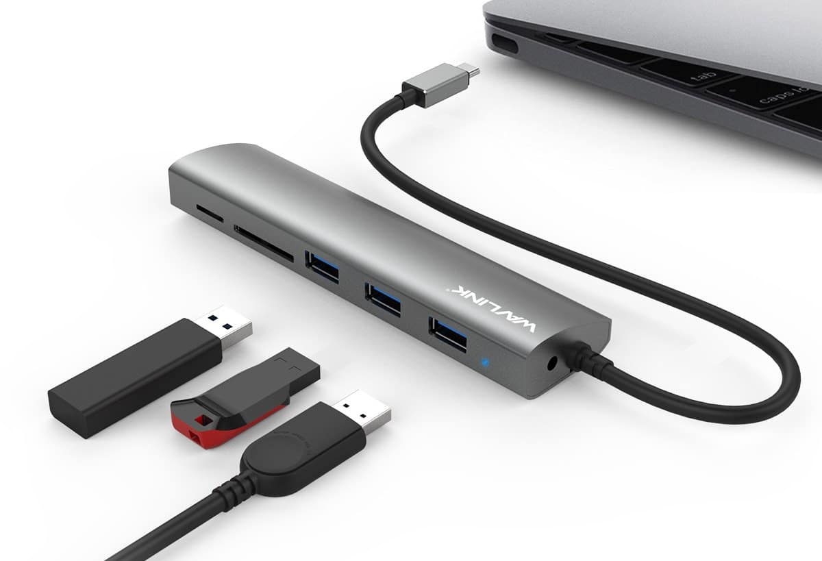 De USB-C naar 3x USB 3.0 en SD + MicroSD kaartlezer adapter van Wavlink is een handige adapter met meerdere poorten in één.